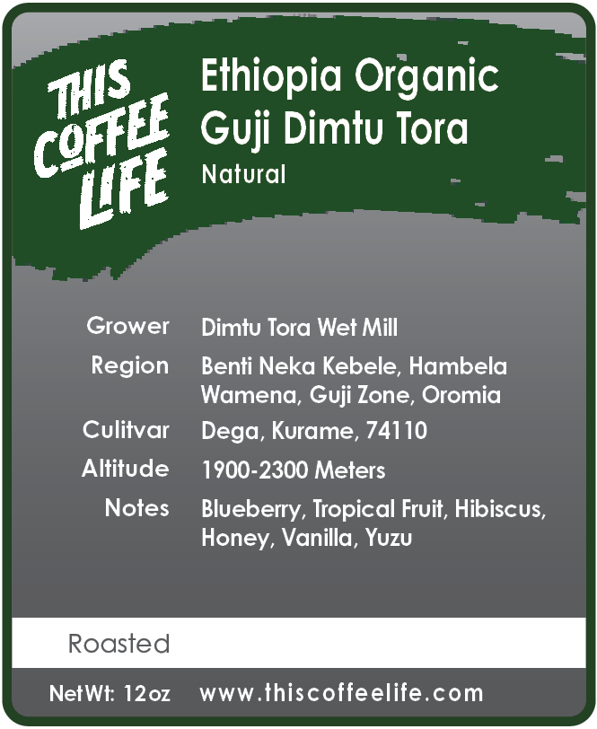 Organic Guji Dimtu Tora G1 Natural is a vibrant and aromatic coffee sourced from the Dimtu Tora kebele in the Hambela Wamena woreda, located in the Guji zone in Oromia, Ethiopia. This coffee comes to us from Azeb Tadesse and was processed at the Dimtu Tora coffee processing station, a mill established in 2022. The coffee was grown at altitudes ranging from 1900 to 2300 masl, contributing to its complex flavor profile.